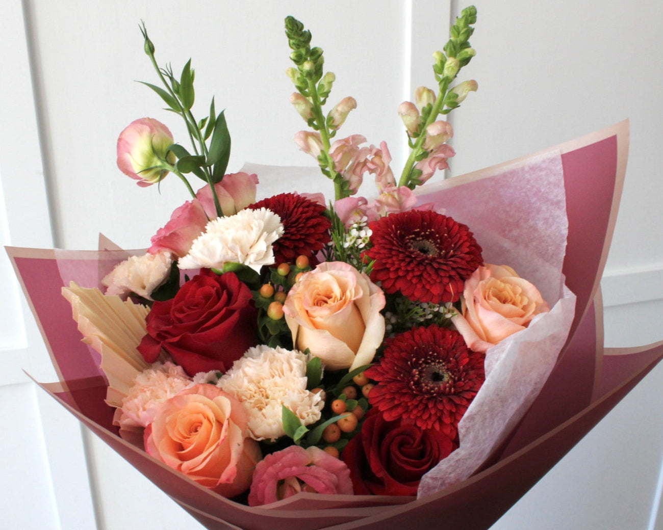 Elegant and romantic, the Peach and Red Charm bouquet is a graceful blend of soft peach roses, deep red blooms and delicate accents of greenery. This bouquet balances warmth and sophistication, making it a perfect gift for love, celebrations, or simply to brighten someone’s day.