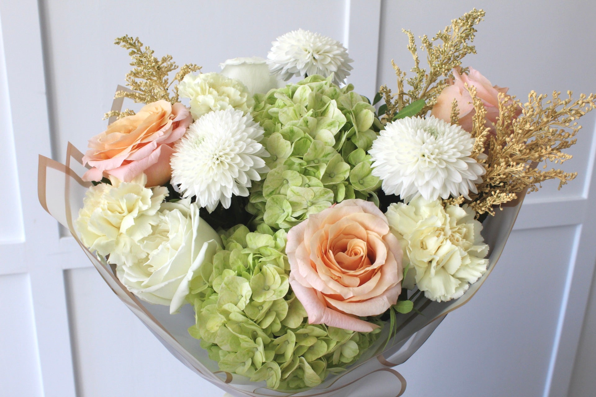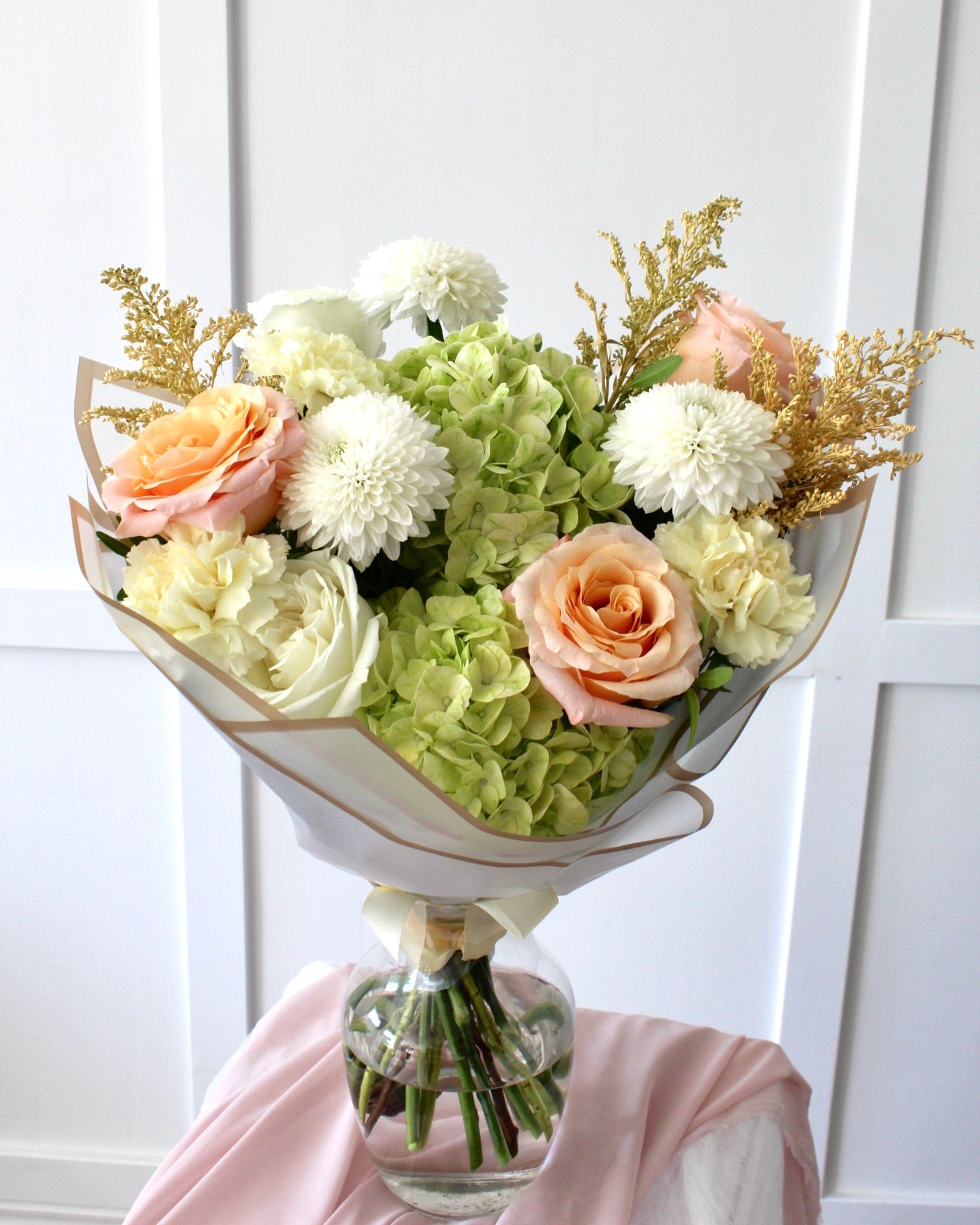 Soft Blooms is a graceful bouquet that captures elegance in its purest form. Featuring light green hydrangeas, soft peach roses, white chrysenthamum, and delicate accents, this bouquet radiates timeless beauty. Perfect for weddings, anniversaries, or simply brightening someone’s day, its gentle tones create a serene and romantic feel. Wrapped in a modern, minimalist style, Soft Blooms makes a stunning gift for any occasion.