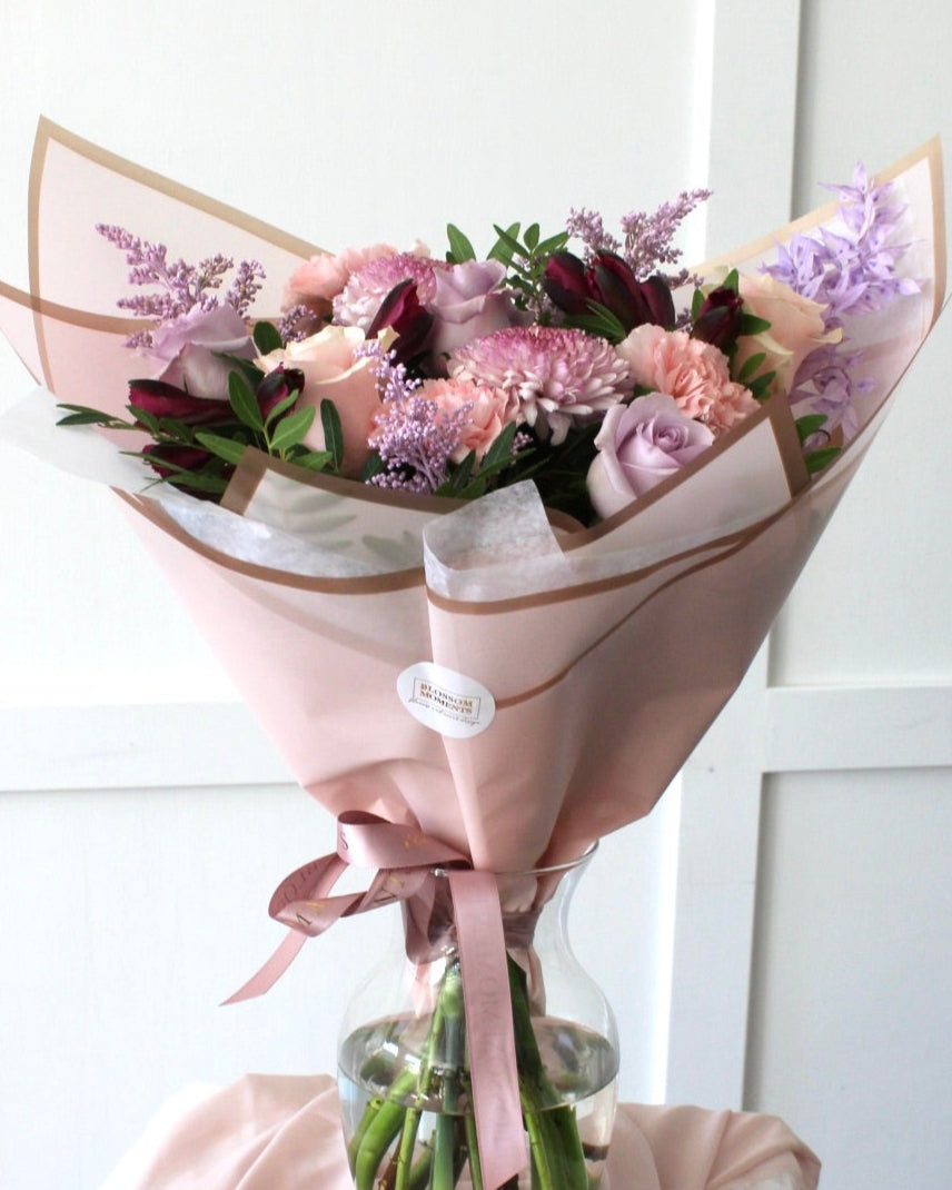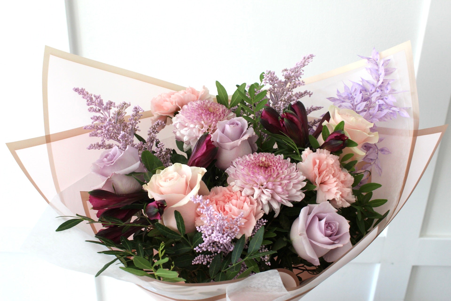 Step into a world of soft romance with Violet Dream — a luxurious arrangement that weaves together lavender roses, blush carnations, dusky mauve chrysanthemums, and touches of deep plum alstroemeria. Delicate lilac fillers and fresh greenery add a light, dreamy texture to complete this ethereal bouquet.