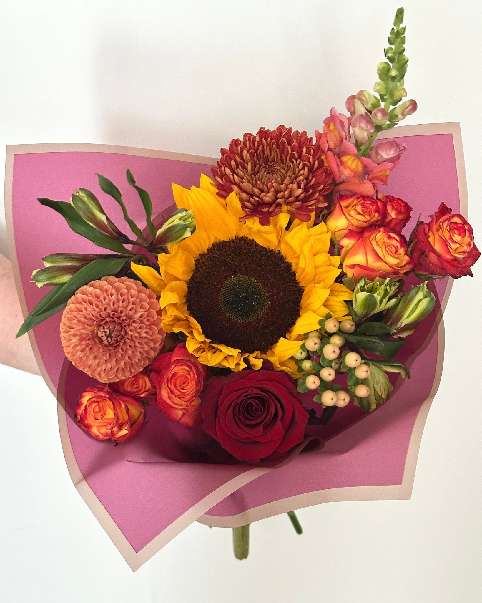 Expertly hand-tied and wrapped in elegant, red toned paper, Autumn Radiance is a stunning expression of warmth, gratitude, and seasonal beauty — perfect for gifting or adding a festive touch to your home.