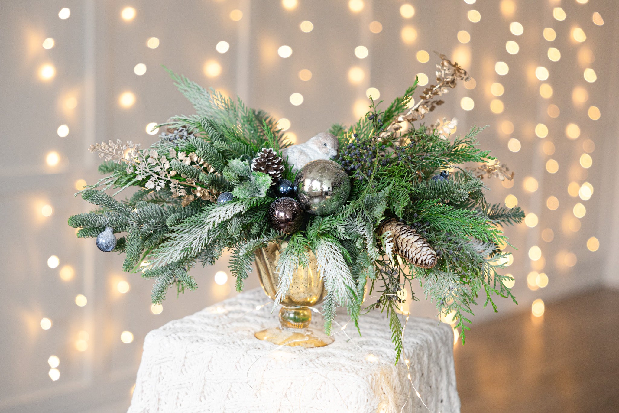 Transform your holiday table with our exquisite Christmas table arrangement. Adorned with vibrant Christmas greenery, festive tree decorations, and artificial gold and silver elements, this holiday centerpiece adds a touch of seasonal magic to your celebrations. Nestled among pine cones is a charming silver bird, bringing a whimsical flair to your festive setting.